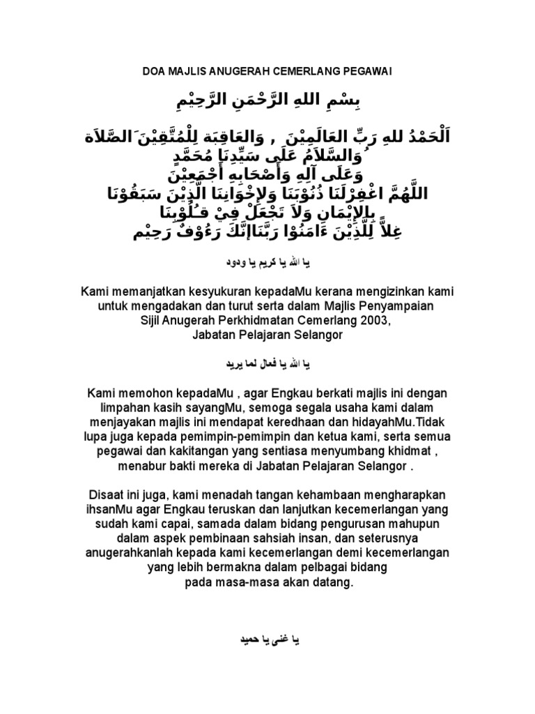 Malah kami memohon daripadaMu Ya Allah dengan penuh ketaakulan agar majlis anugerah ini akan. Kepada individu yang selalu ditugaskan untuk membaca doa kadangkala dipanggil pada saat-saat akhir untuk melafazkan doa di hadapan khalayak ramai sebelum sesuatu majlis dimulakan. Assalammualaikum warahmatullahi wabarakatuh salam sejahtera dan salam 1.
